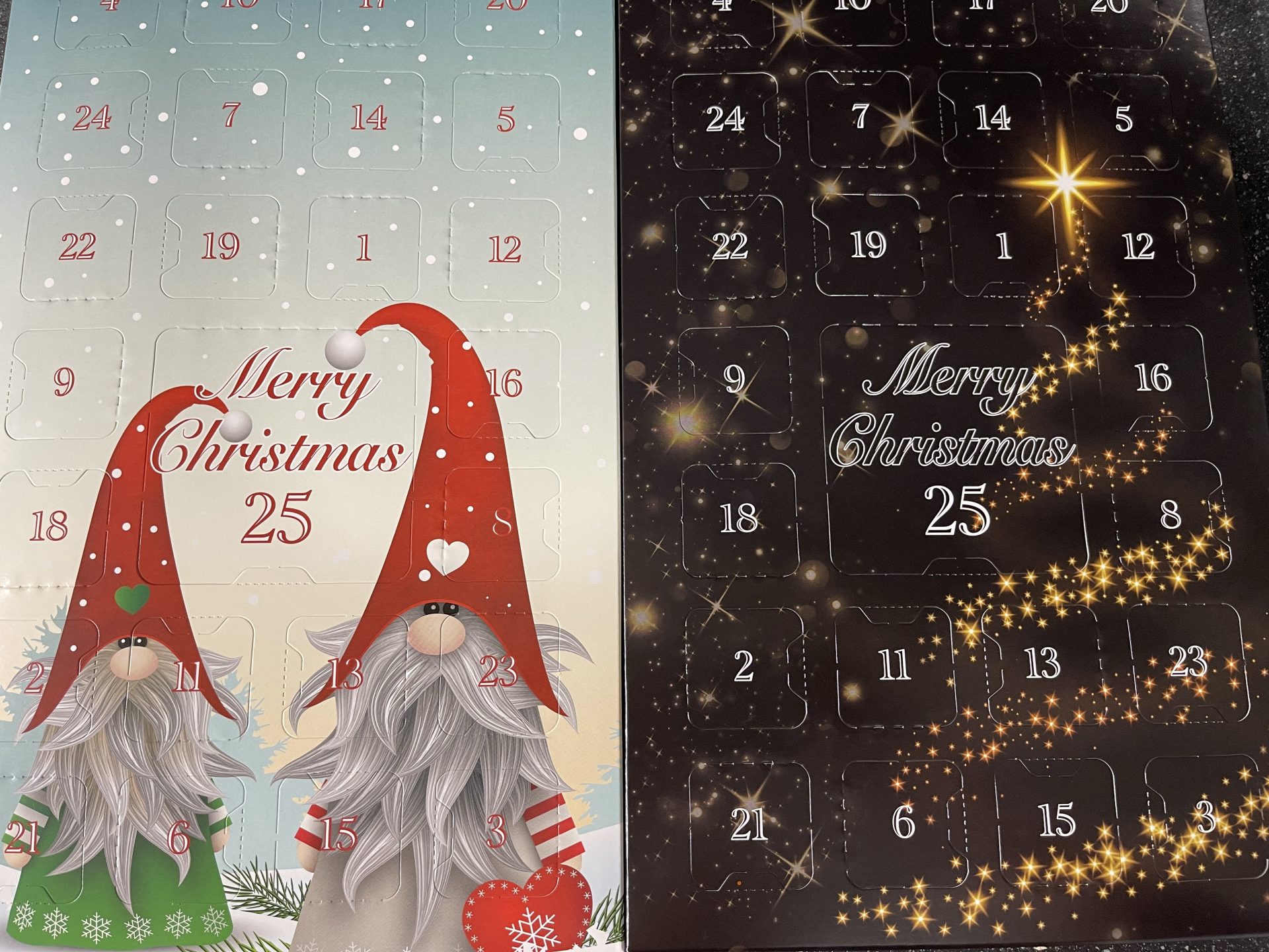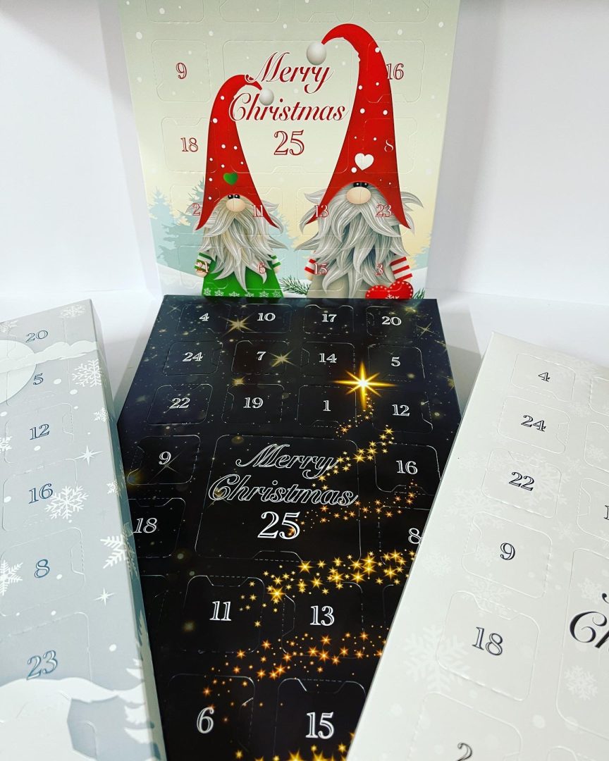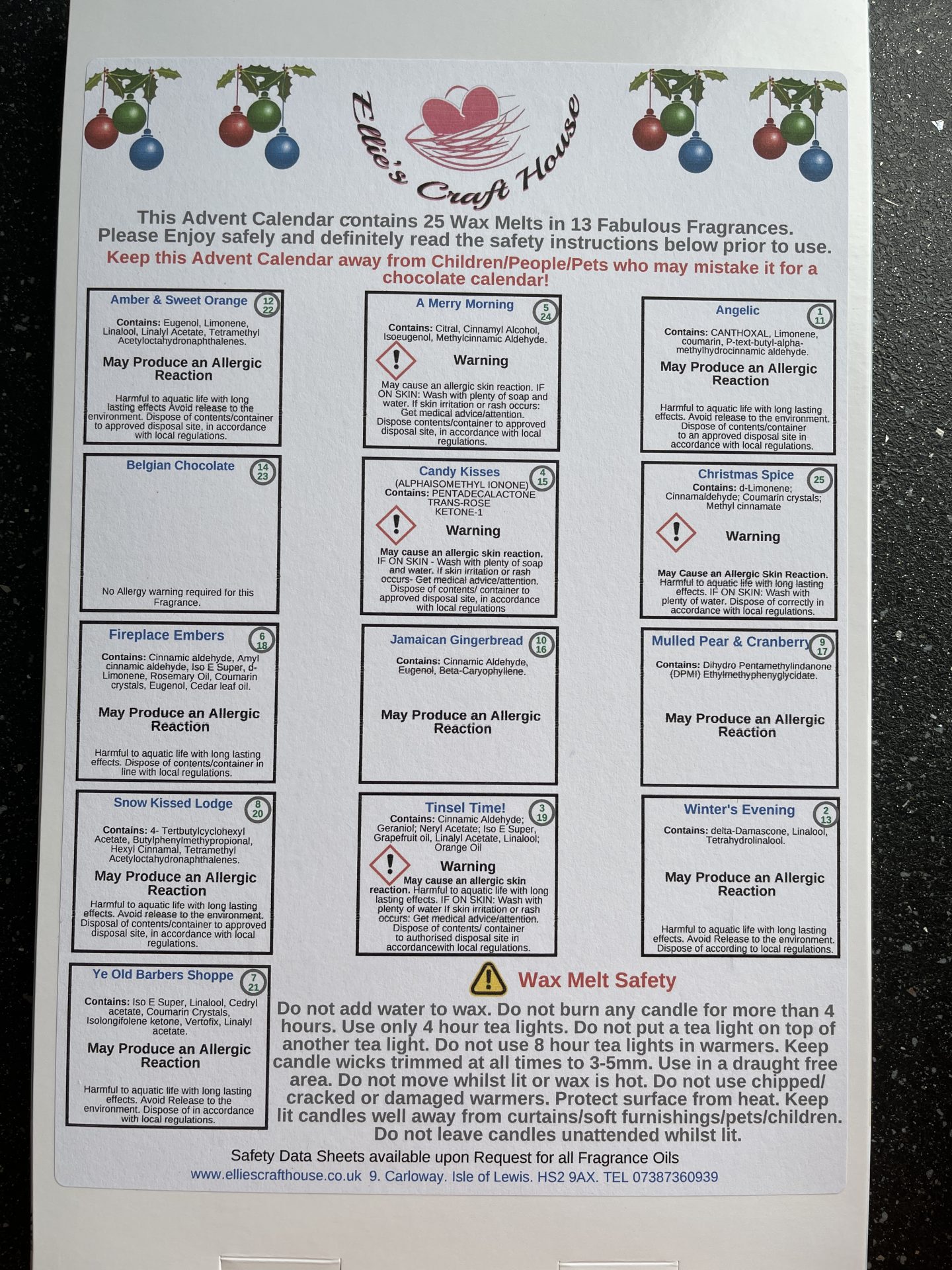 Fragrances in each calendar are – Angelic, Winters Evening, Tinsel Time, Candy Kisses, A Merry Morning, Fireplace Embers, Ye Olde Barbers Shoppe, Snow Kissed Lodge, Mulled Pear & Cranberry, Jamaican Gingerbread, Amber & Sweet Orange, Belgian Chocolate, Christmas Spice. A full description of the Fragrances is available on our Fragrance Info page along with Allergy info where applicable.